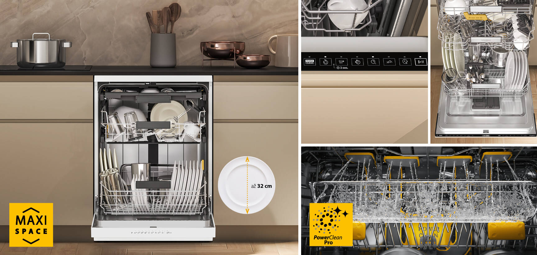 ...nové myčky Whirlpool z řady MaxiSpace přicházejí s revolučním uspořádáním vnitřního prostoru, který je díky konstrukčním změnám výrazně větší, a to při zachování vnějších rozměrů? Některé z modelů jsou vybaveny 3. zásuvkou s integrovaným ostřikovacím ramenem, která je oproti klasickým příborovým zásuvkám hlubší, ale nijak neomezuje prostor ve středním a spodním koši. Do ní se bez problémů vejdou sklenice vysoké až 13 cm a naopak do spodního koše, při středním koši v horní poloze, mohou zákazníci umístit i pizza talíře vysoké až 32 cm.