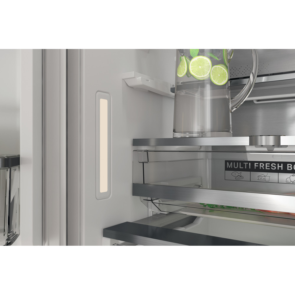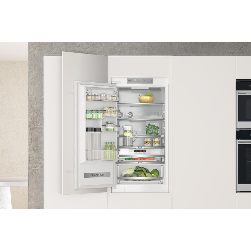 Přednosti této vestavné kombinované chladničky Whirlpool: bílá barva. Skleněné police, které poskytují pevnost i eleganci. Ventilátor, který zajišťuje plynulé a rovnoměrné proudění vzduchu v prostoru spotřebiče pro doonalou cirkulaci vzduchu. Senzory 6. SMYSL, které automaticky snižují teplotu uvnitř spotřebiče po přidání nových potravin, čímž snižují spotřebu energie. Robustní přihrádka na lahve pro bezpečné uložení lahví.